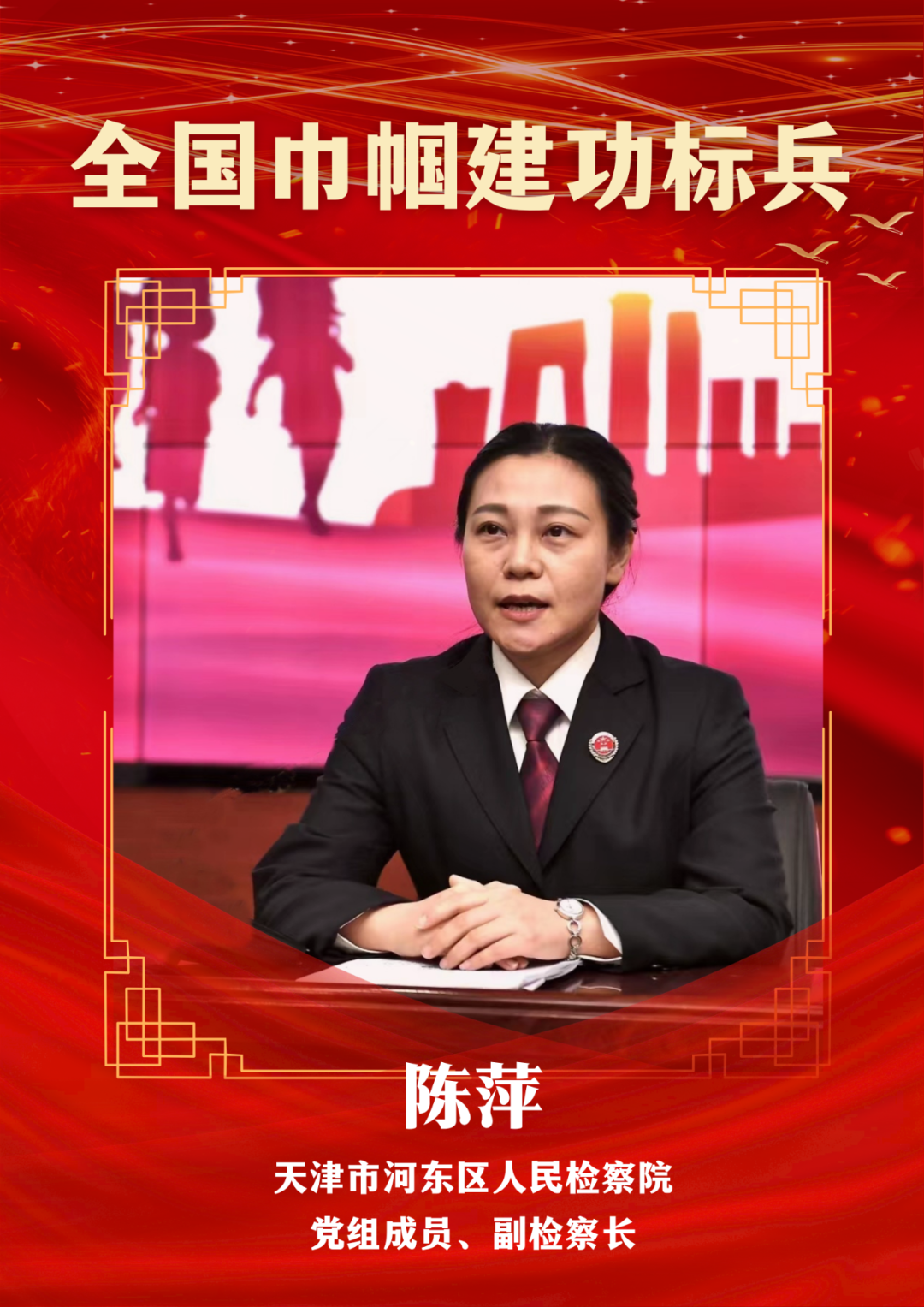 为表彰先进、树立榜样,进一步引领和激励广大妇女坚定不移听党话、跟党奋进新征程,豪情满怀、意气风发投入推进中国式现代化的伟大实践,近日,全国妇联发布决定,表彰全国三八红旗手标兵、全国三八红旗手、全国三八红旗集体和全国巾帼建功标兵、全国巾帼文明岗、全国巾帼建功先进集体,其中,天津市河东区人民检察院党组成员、副检察长陈萍荣获全国巾帼建功标兵。